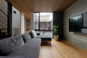 住宅街の狭い土地の中でも中庭を設け、建物の中心に木を植えることで、
